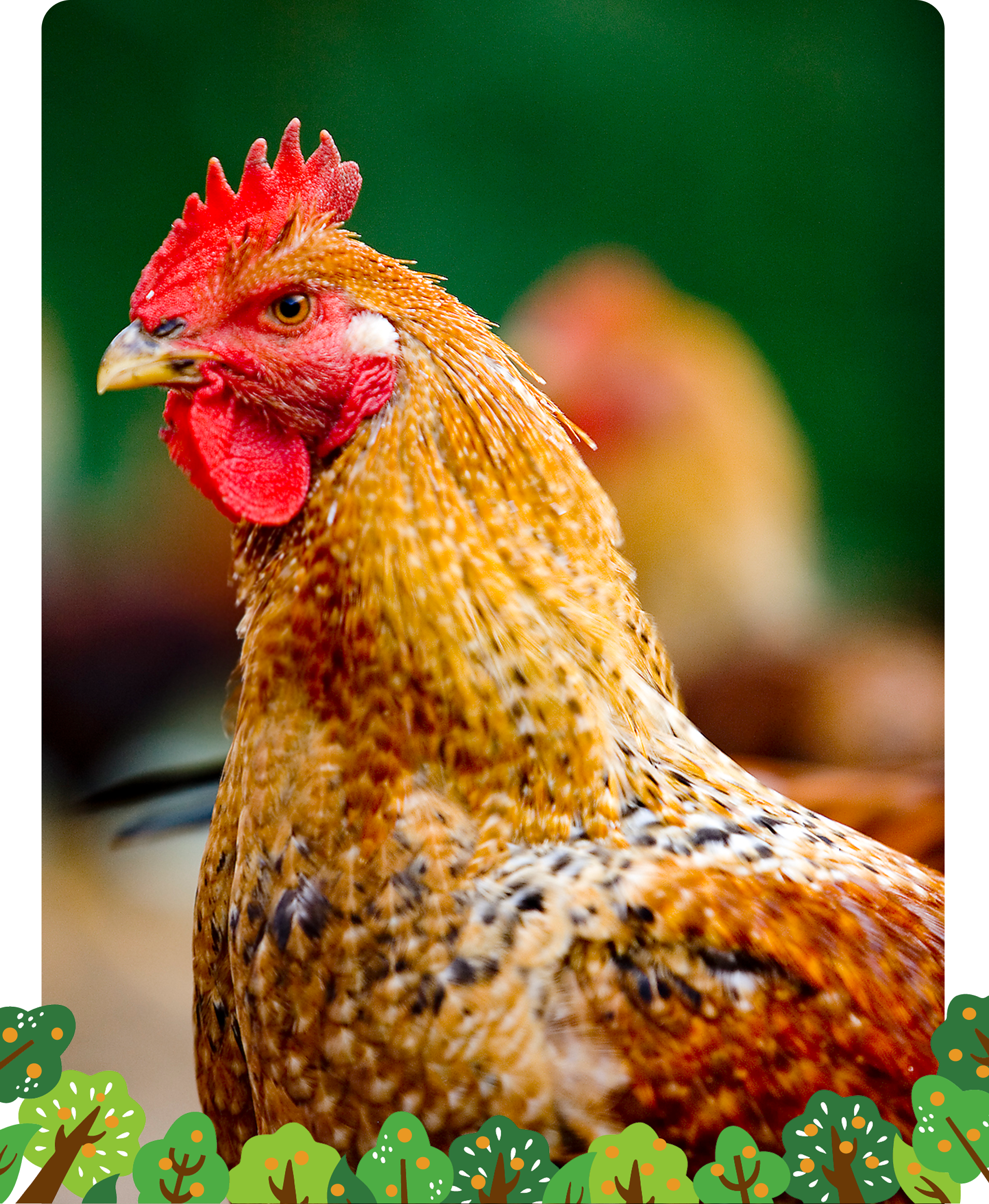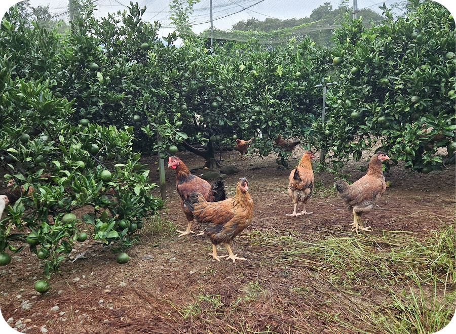 みやざき地頭鶏は平飼いで1平方メートルあたり2羽以下という厳しい飼育基準があります。橘香園ではさらに厳しい1平方メートルあたり1羽以下という独自の基準で飼育しており、鶏にとってストレスが掛からない環境となっています。広大なみかん畑で、夏はみかんの木陰でひと休み、冬は自由気ままに畑を散策しています。